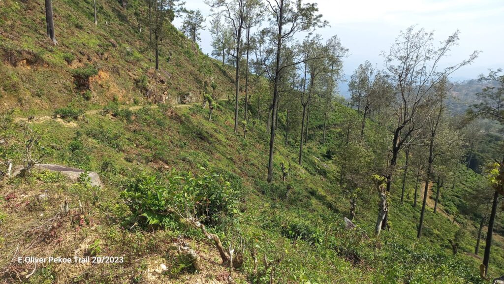 Once again we went with the dogs into the hectic, noisy small town of Uda Pussellawa. The new hiking trail started right across the street. On the way we bought shorties and bananas for breakfast. We wanted to eat them as soon as a good spot was found. Where? The dogs would find the right spot for us if they were free. And that’s how it happened. As soon as we were in the tea plantation and there were no more people or dogs around, both were allowed off the leash. It wasn’t long before they were chasing each other through the tea bushes. At this location we had a great view of the landscape, Uda Pussellawa, our guest house, our hike from the day before and a mountain range at Brookside/Sooriyakanda.